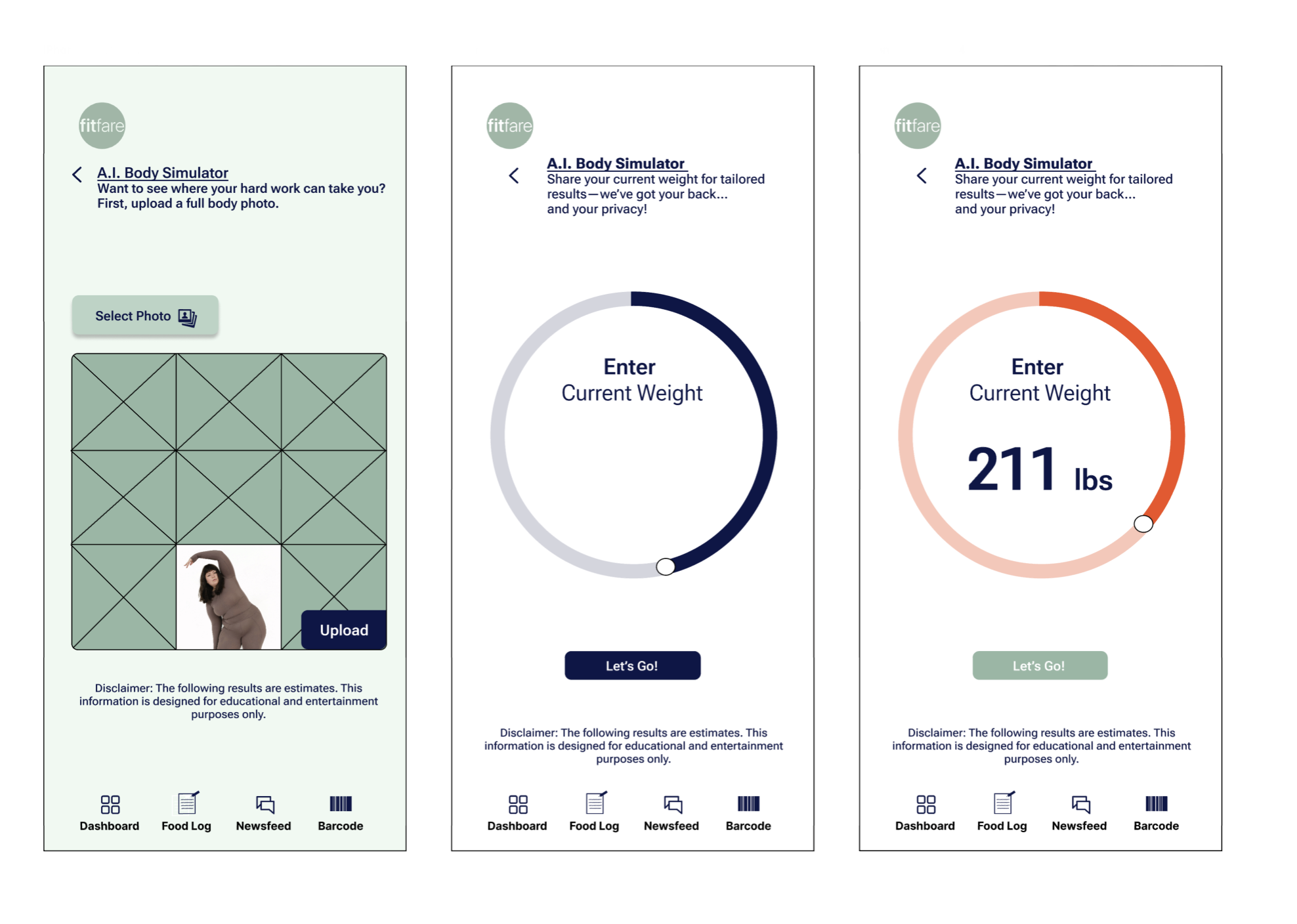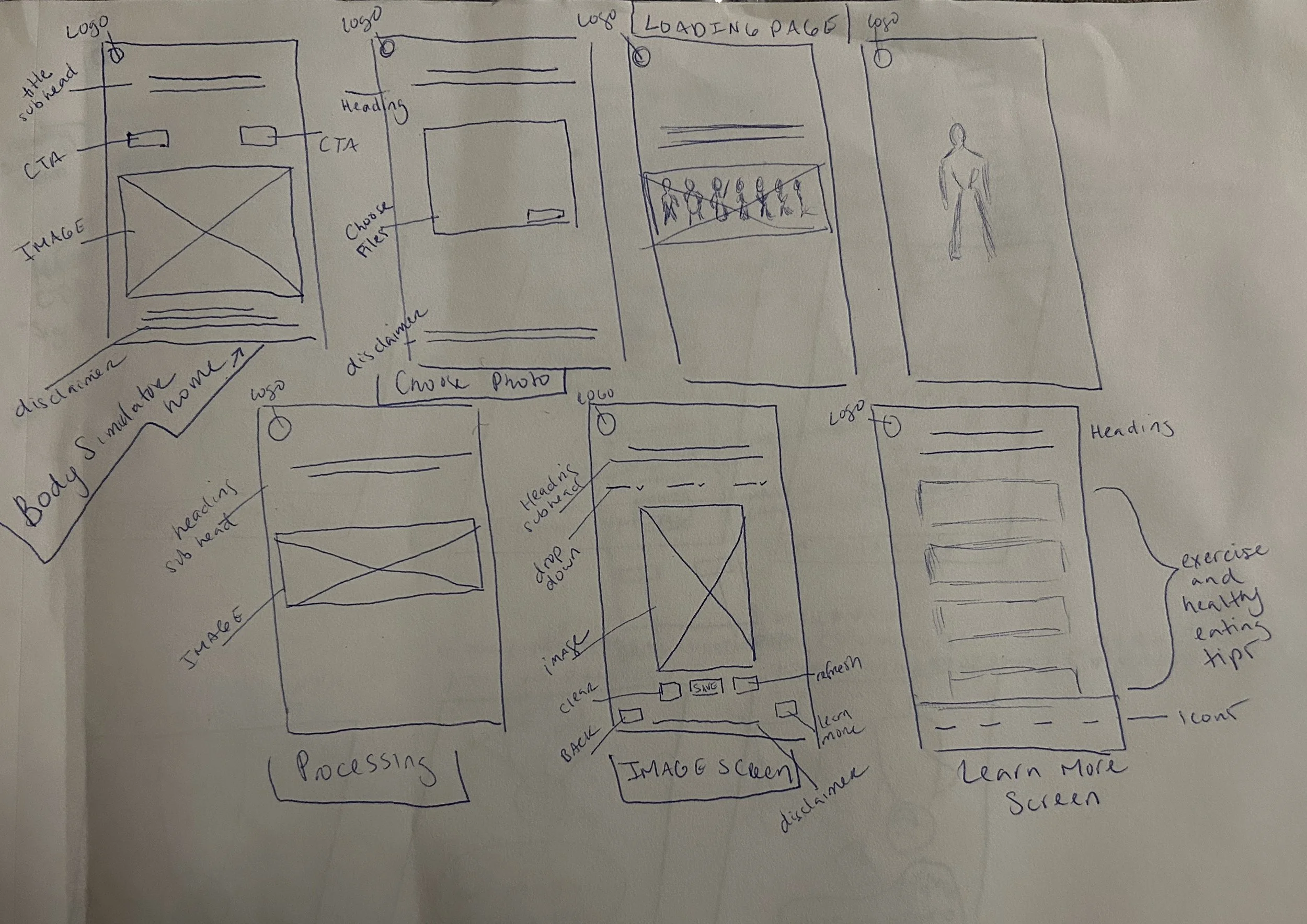 After initial sketches the key low fidelity screens for the body simulator feature was created. These screens show the photo selection, simulator results, and catered steps based on your results.