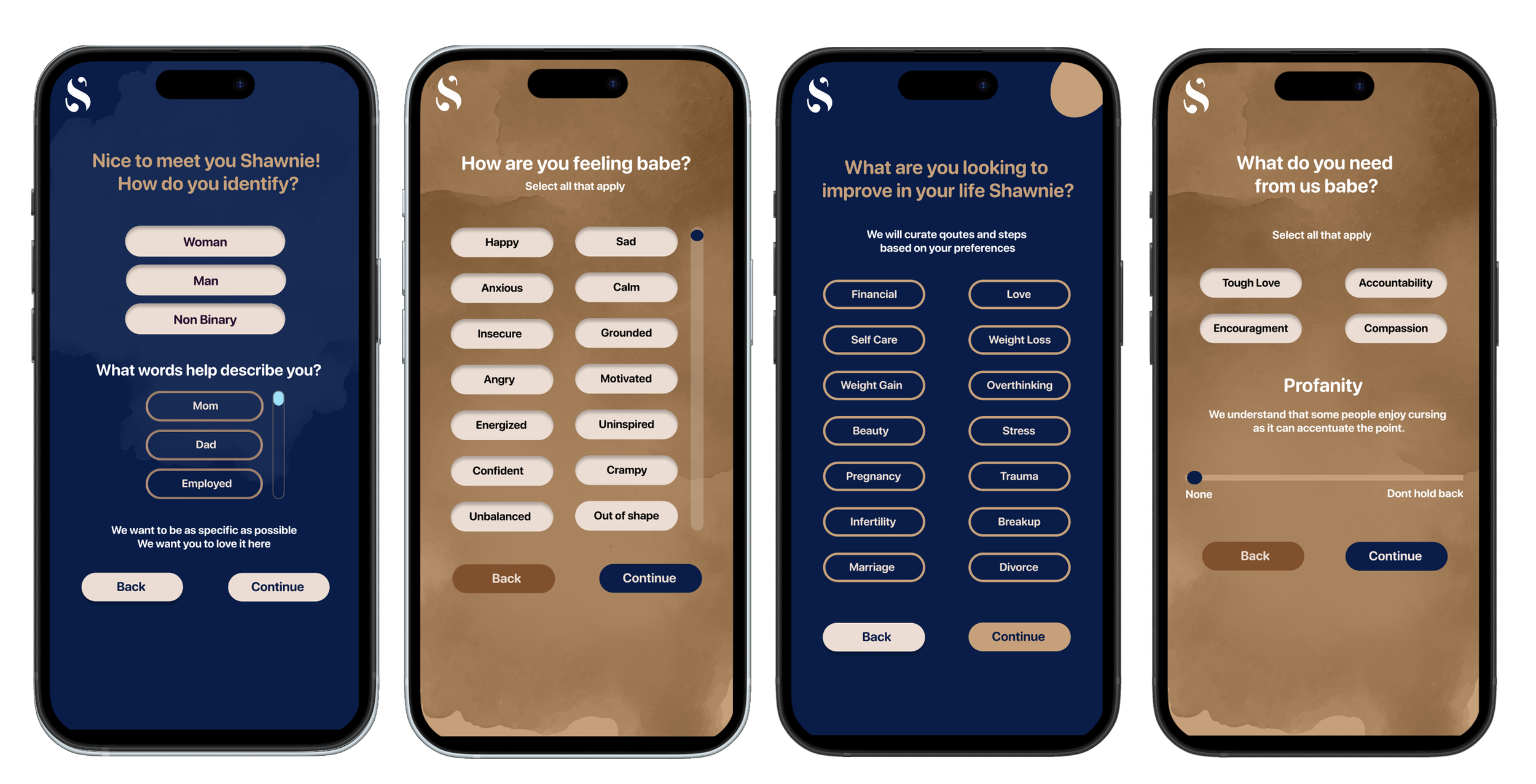 I designed a personalized motivation app that promotes self-care by delivering tailored quotes, reminders, and actionable steps. The app features an intuitive onboarding process, allowing users to set their preferences upfront, ensuring they receive relevant and meaningful motivation. Personalization includes name, pronouns, feelings, areas of improvement, needs, frequency, and display preferences.